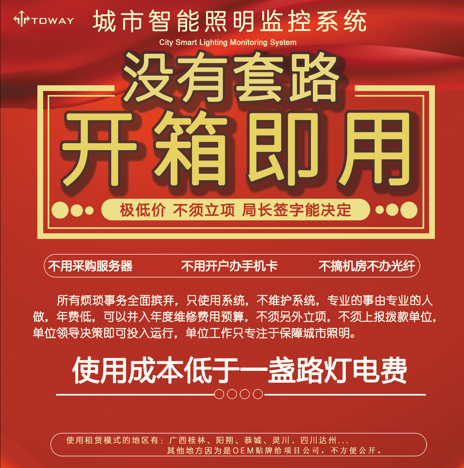 此方案對(duì)于一個(gè)縣城100臺(tái)路燈配電箱的體量,首年開支也只有三萬五千元,此后每年費(fèi)用是兩萬五,本方案最大的優(yōu)點(diǎn)就是費(fèi)用低廉,這筆費(fèi)用完全可以并入年度維護(hù)撥款中核銷。且不會(huì)有設(shè)備過保要重新采購的問題出現(xiàn)。